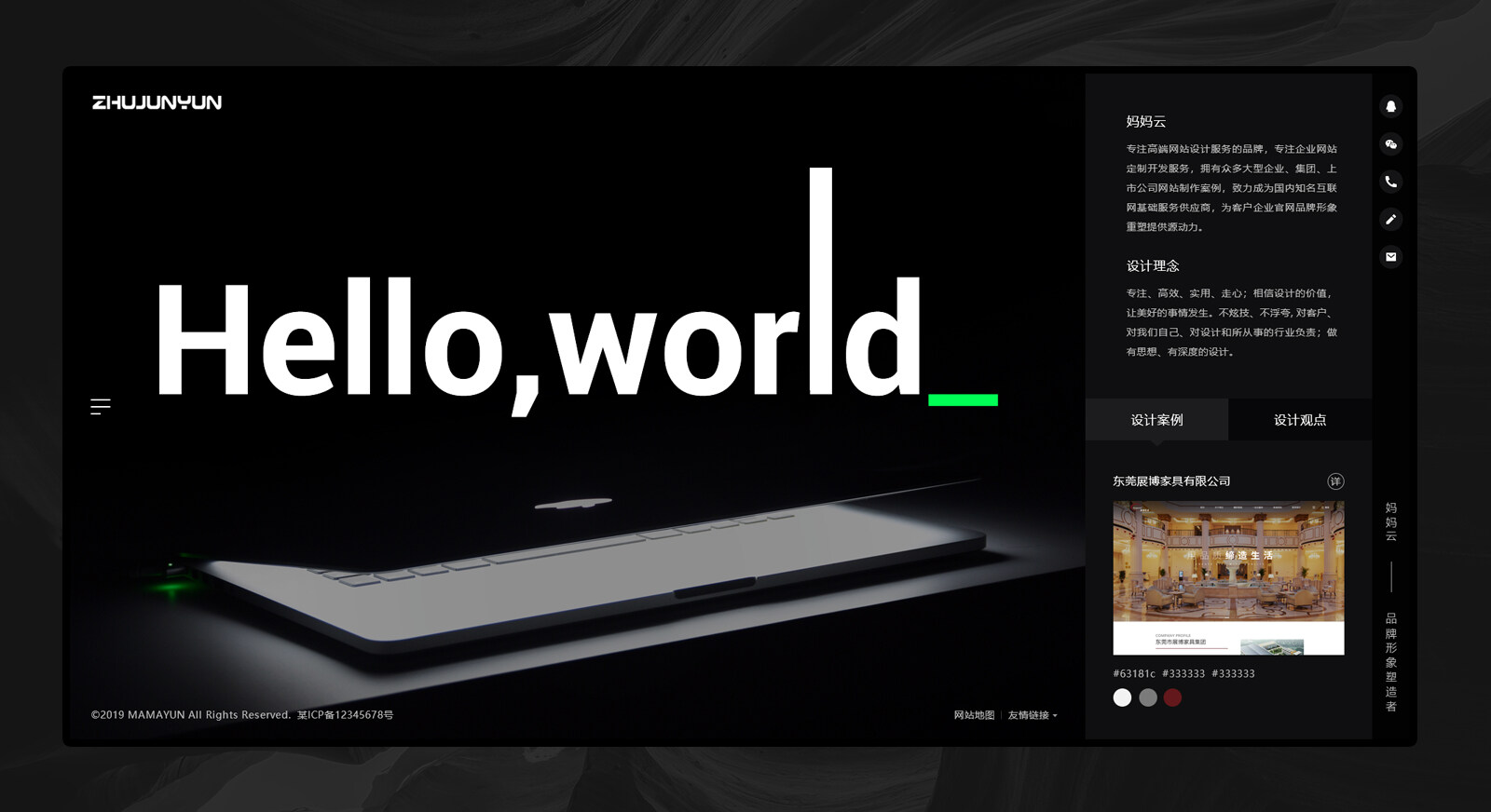網(wǎng)站整體配色方面,在使用深色為主的情況下使用熒光綠色為輔色,多種顏色的搭配會產(chǎn)生強烈的對比感突出主體內(nèi)容的同時,更強化高端與視覺聚焦的效果。
